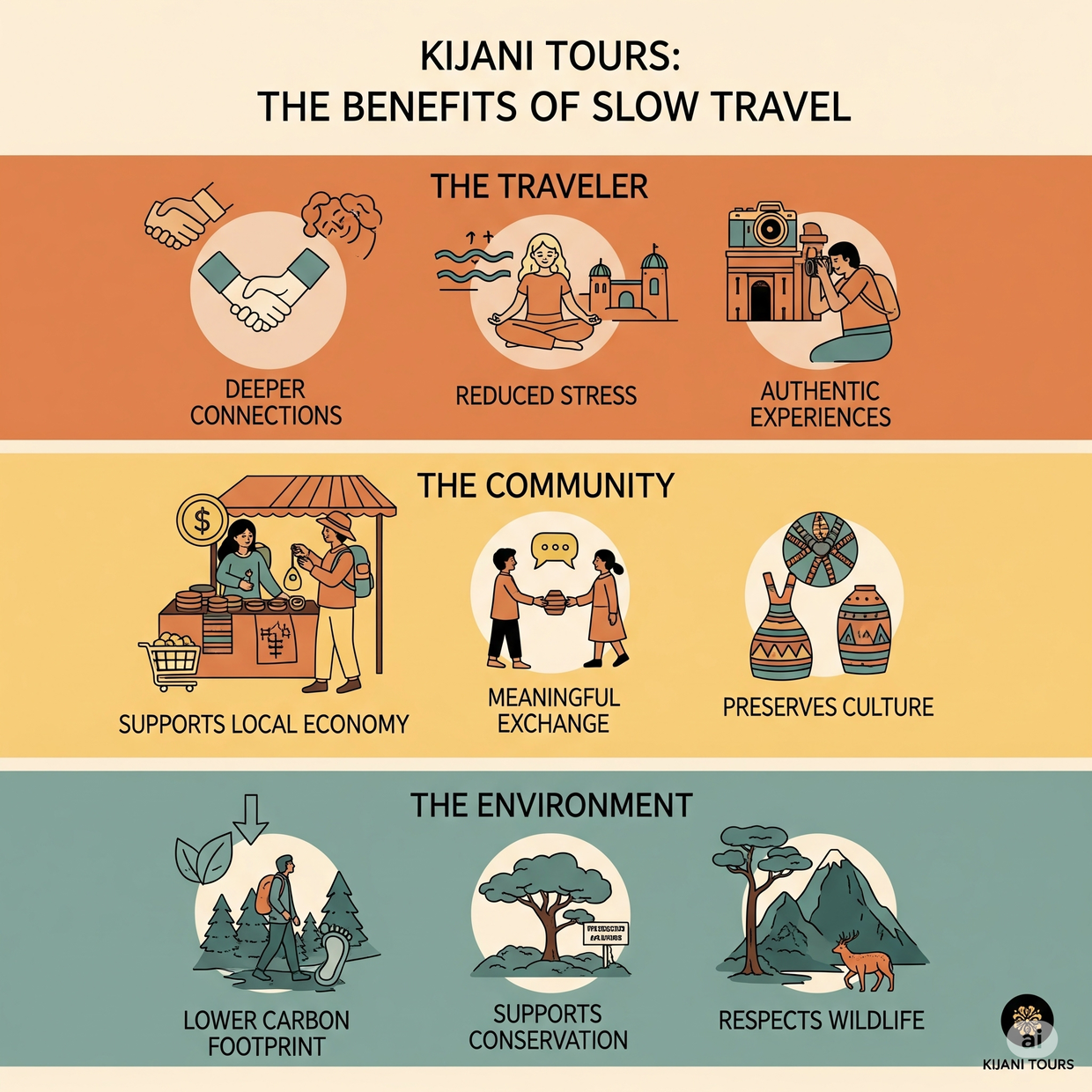 Join the beat of slow travel with Kijani Tours. Let us together discover the art of meaningful connections and craft journeys that touch the soul. Whether walking through verdant landscapes or interacting with hands-on cultural experiences, the way ahead is one of genuineness. Ready to revolutionize your travels and be a conscious explorer? Let's embark on the journey.